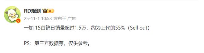 一加15首銷日的銷量超過1.5萬臺,同比約為一加13的55%。也就是一加15同比一加13首銷日的銷量是下滑的。