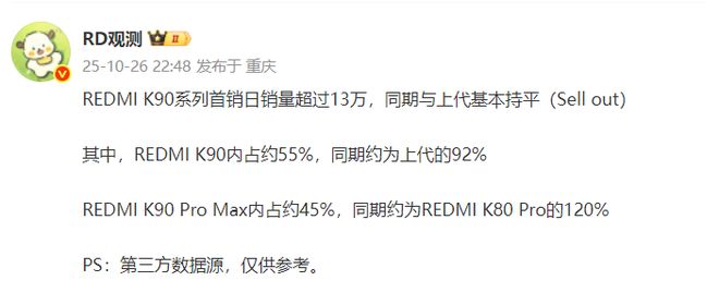 REDMI K90系列首售當天是超過13萬臺,其中REDMI K90 Pro Max整體占比約為45%,同比REDMI K80 Pro達到120%,也就是同比增長了20%。算下來銷量大約為5.85萬臺;