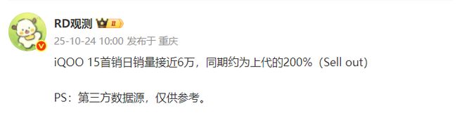 iQOO 15首售當天賣了近6萬臺,同比約為iQOO 13的200%,換言之iQOO 15在首銷日同比上一代提升100%,也就是翻了一倍。