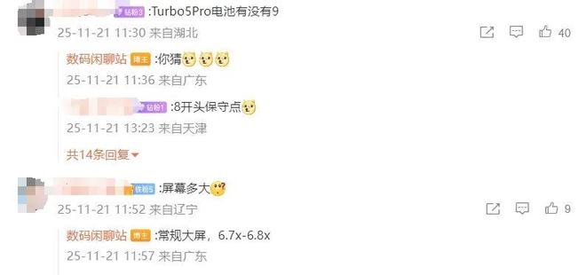 后續(xù)有用戶在評論區(qū)詢問:“Turbo5Pro 電池有沒有 9”,博主回復道:“你猜”;另一名用戶則詢問道:“屏幕多大”,博主回復道:“常規(guī)大屏,6.7x-6.8x”;