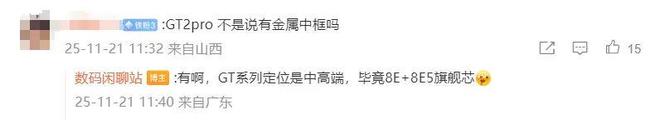 而另外一名網(wǎng)友則詢問道:“GT2pro 不是說有金屬中框嗎”,博主則回復道:“有啊,GT 系列定位是中高端,畢竟 8E+8E5 旗艦芯”。