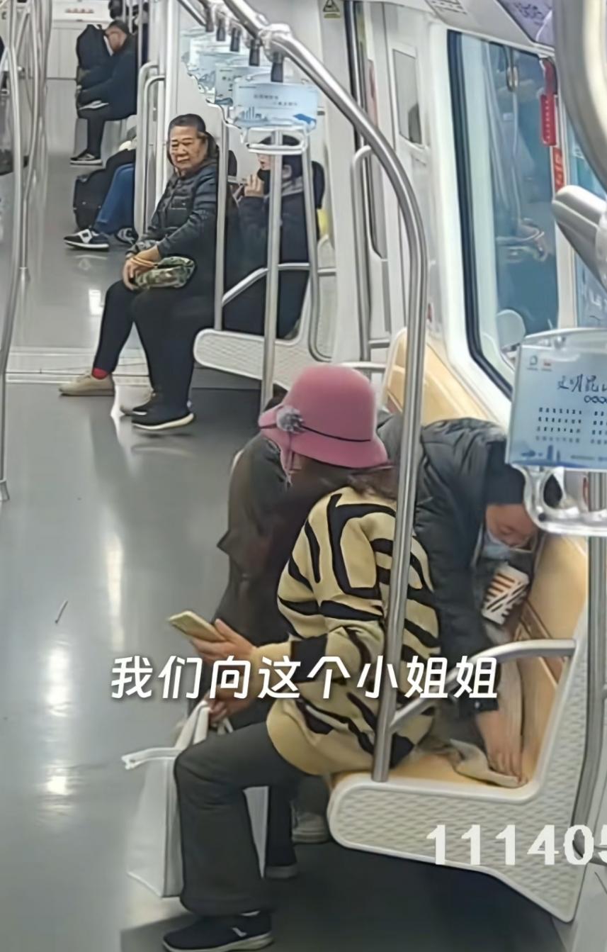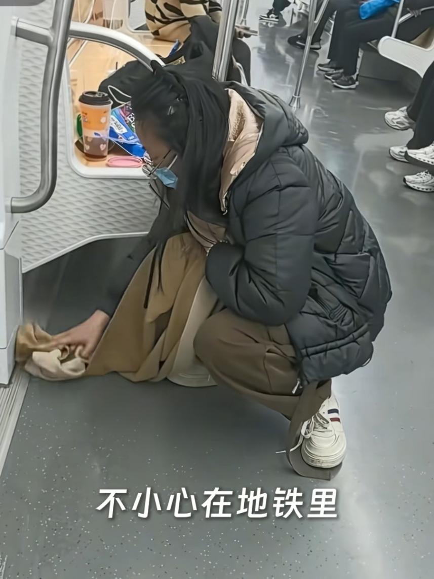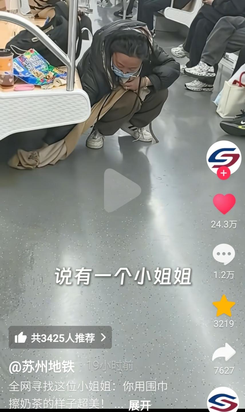 事情起因是這樣的:12月3日中午,蘇州地鐵11號(hào)線上,一名女乘客不小心將奶茶打翻,奶茶灑在了座位和地上,女乘客身上并未攜帶紙巾,情急之下女乘客取下脖子上的圍巾,蹲下身將撒在座位上和地上的奶茶擦干凈,這一幕被對(duì)面的乘客拍了下來。